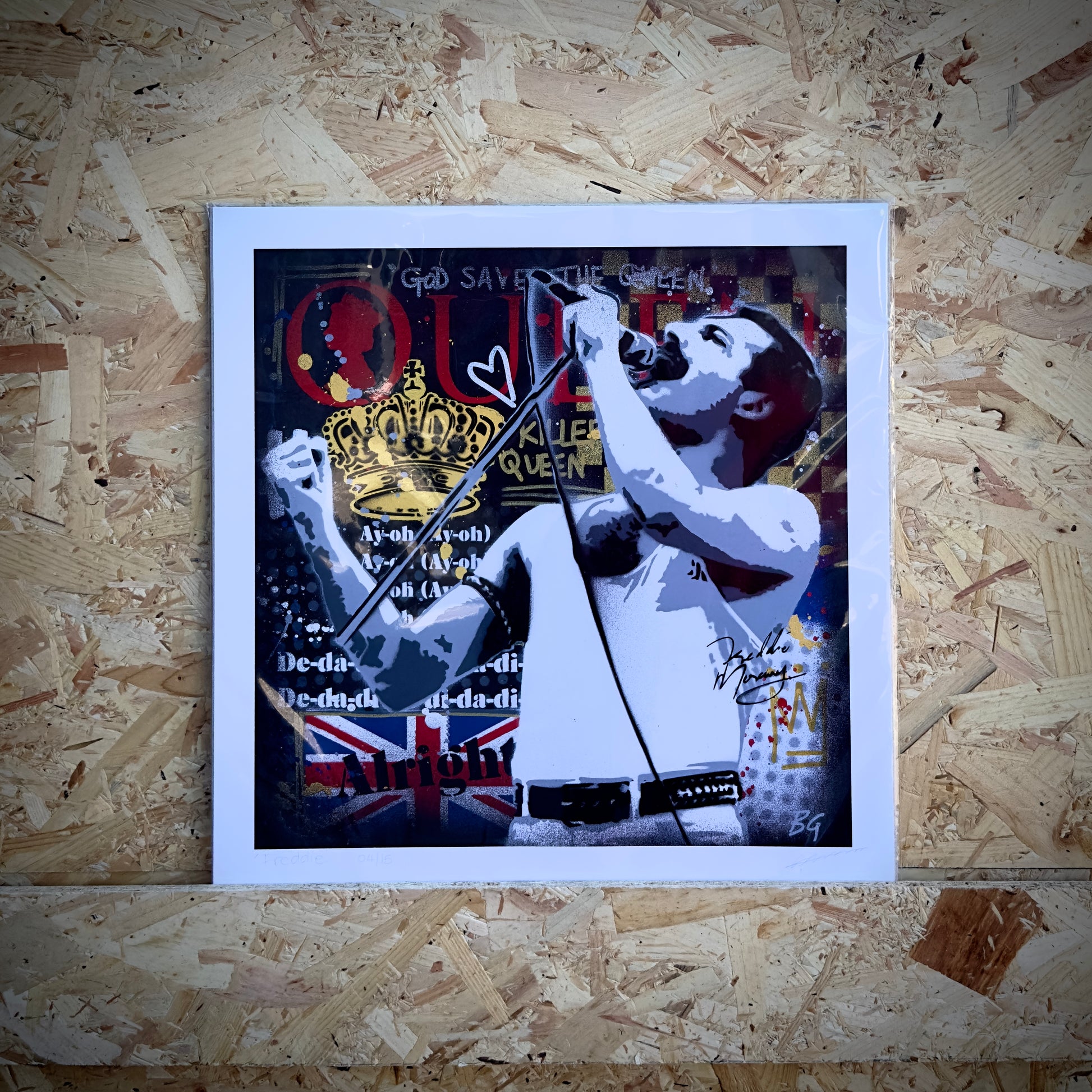 This is a medium print of a commission which was inspired by arguably one of the world's greatest voices. On a street art/graffiti background themed with royal colours and the band itself.