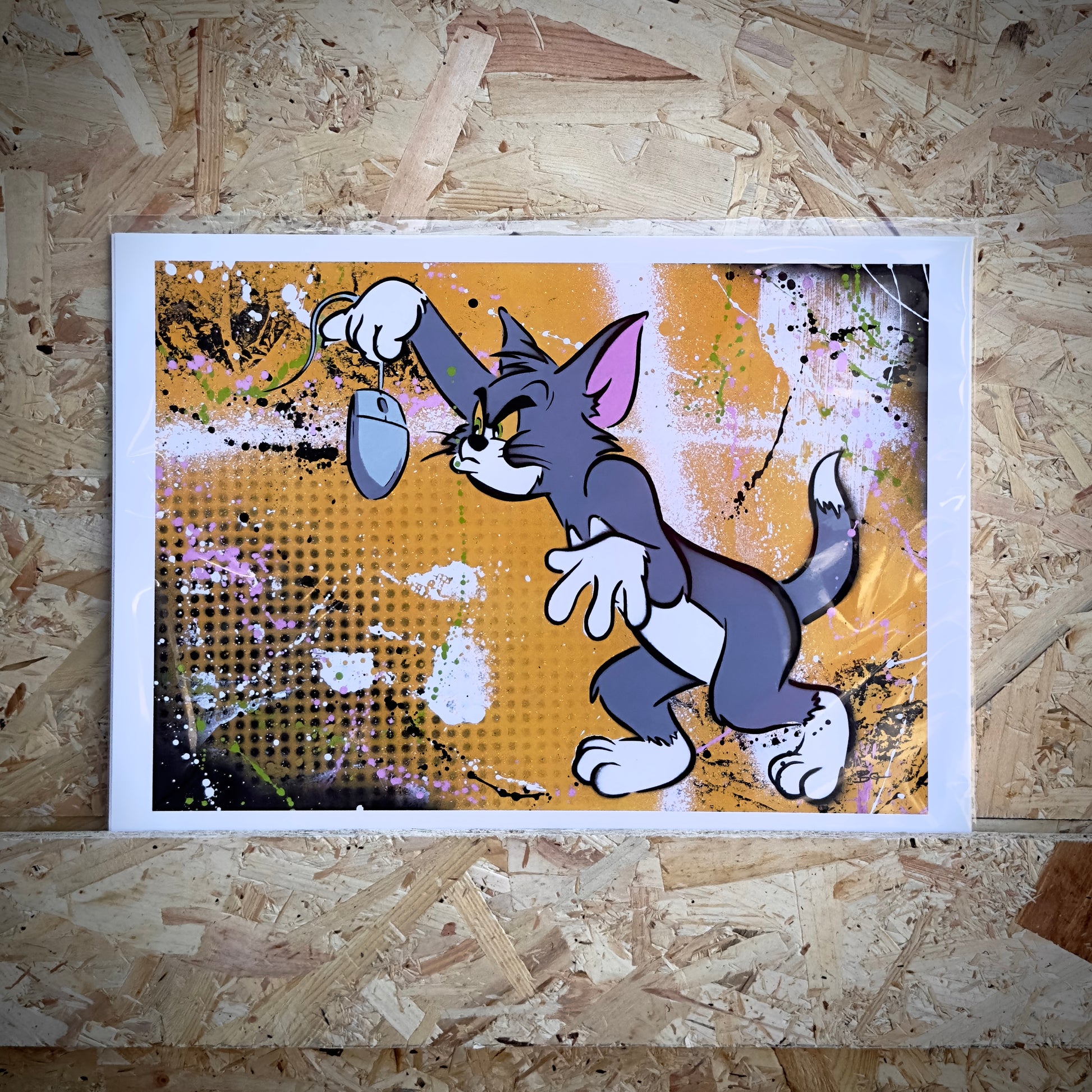 Cat and mouse is one of my favourite pieces. The disgruntled retro cat is holding a modern representation of a mouse, somewhat angry that technology is taking over Childrens formative years where cartoons and tv were exclusively reserved for after school and Sunday mornings.